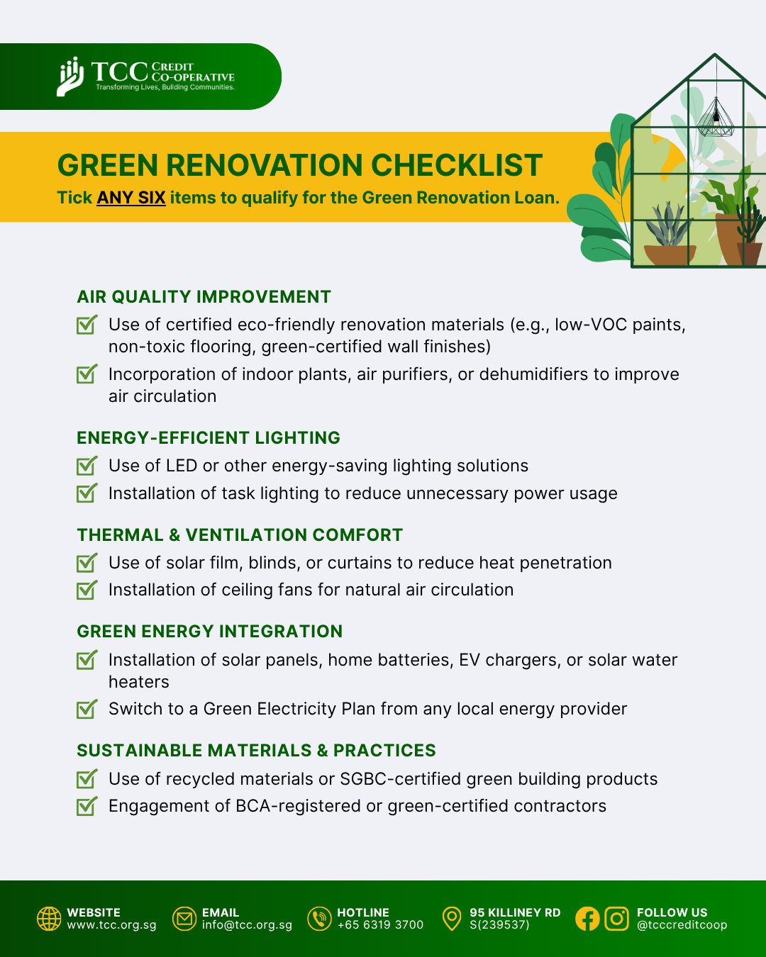 You can access the TCC Green Renovation Checklist here. Fulfil at least 6 out of the 10 items and enjoy an exclusive renovation loan interest rate of 3.5%.